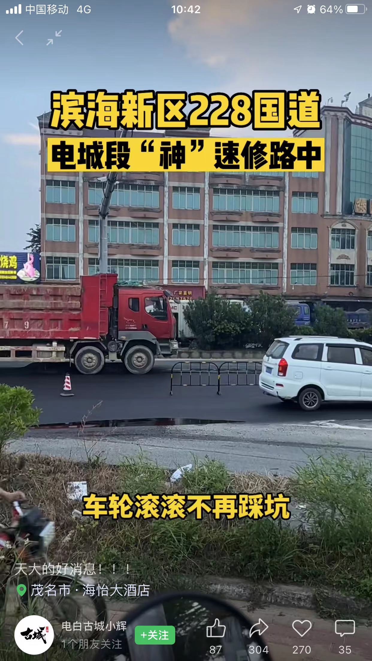 “好消息!好消息!電城這段路終于可以落實改善了!您看,車輪滾滾不再踩坑,好樣的!”近日,一篇有關(guān)G228國道路面修復(fù)工程的知名抖音博主作品得到廣大市民的火爆點贊和熱情評論,一時間,“神”速修路成為當(dāng)?shù)鼐用竦摹盁狳c新聞”。
